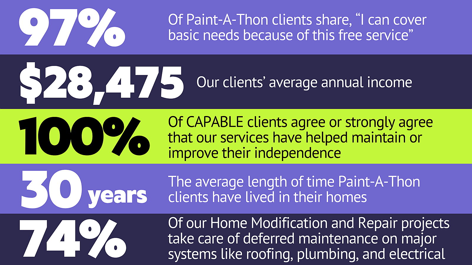 We bring communities together to impact lives and experience the barriers these homeowners face every day through our Paint-A-Thon Program. Paint-A-Thon harnesses volunteer power to paint home exteriors and complete minor yardwork for older adults and individuals living with disabilities. When we work together to paint the exterior of these cherished homes, we prevent HOA fines, preserve home values, increase homeowner confidence, build connection between neighbors, and share in the hope for humanity that comes from service-oriented collaboration.