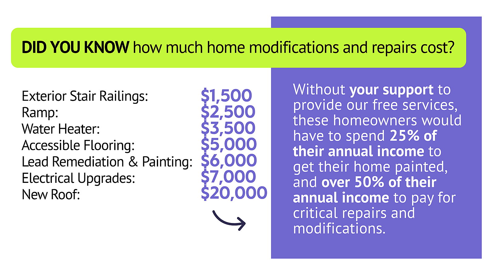Your gift helps us meet our goal of $15,000 - the average cost needed to provide one homeowner with the exterior makeover, critical repairs, and accessibility modifications they need to keep living safely and confidently in their home.
