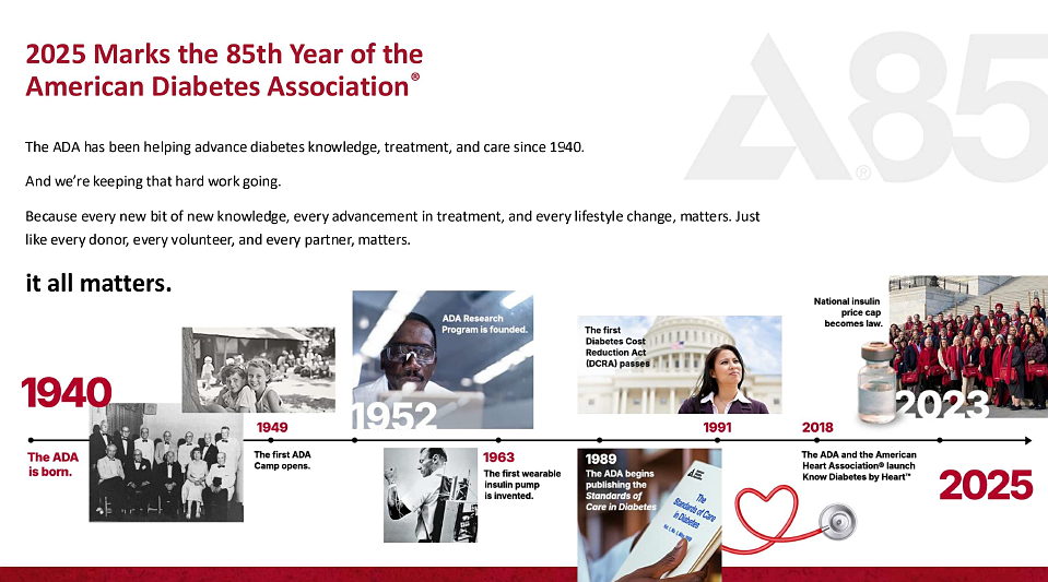 The American Diabetes Association (ADA) is the global authority on diabetes and since 1940 has been committed to its mission to prevent and cure diabetes and to improve the lives of all people affected by diabetes. To tackle this global public health crisis, the Association drives discovery in research to treat, manage and prevent all types of diabetes, as well as to search for cures; raises voice to the urgency of the diabetes epidemic; and provides support and advocacy for people living with diabetes, those at risk of developing diabetes and the health care professionals who serve them.