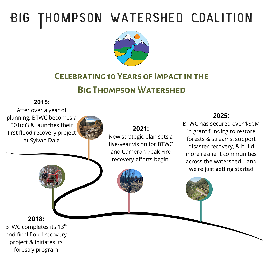 Join us for Colorado Gives Day (November 1 – December 9) — and be part of protecting the Big Thompson watershed as we celebrate our 10-year anniversary! For the past decade, BTWC has worked to strengthen the health of the Big Thompson. We’re proud of what we’ve accomplished together — and we’re looking ahead to the next ten years of impact with your support.