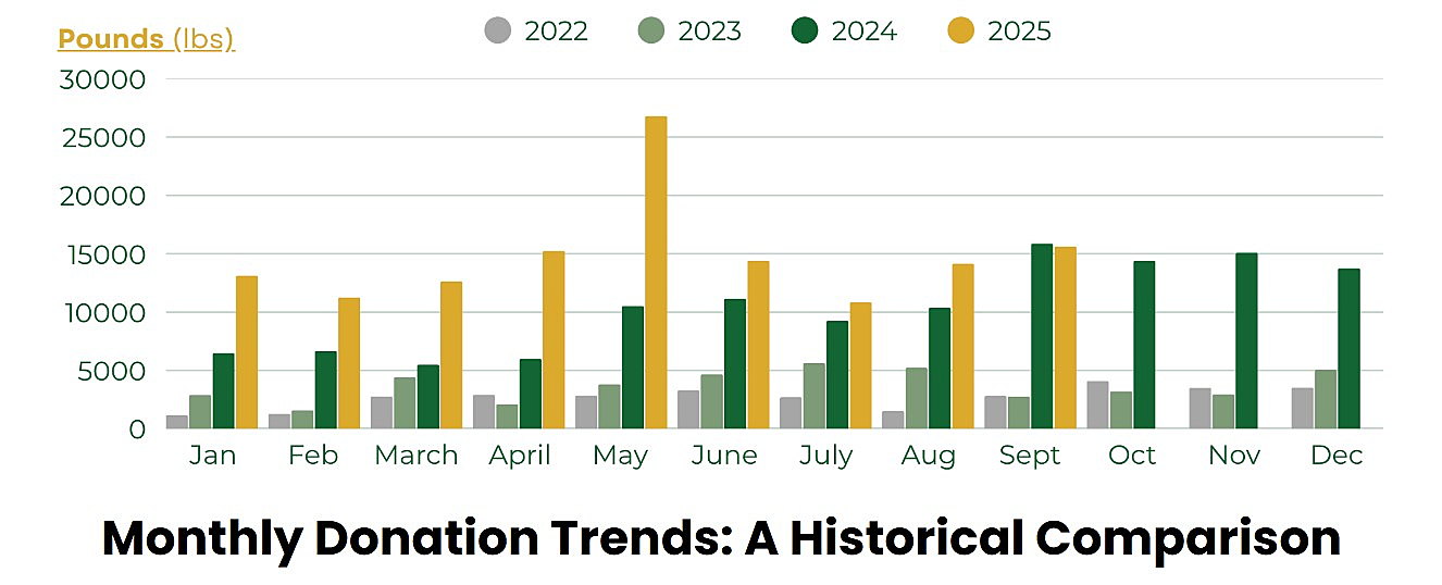 DONATE NOW: This year alone, we’re on track to rescue over 200,000 pounds of surplus food—equivalent to 166,000 meals—and redistribute this nutritious bounty to neighbors in need. By September of 2025 we had already rescued 10,000 pounds more food that we rescued in all of 2024!