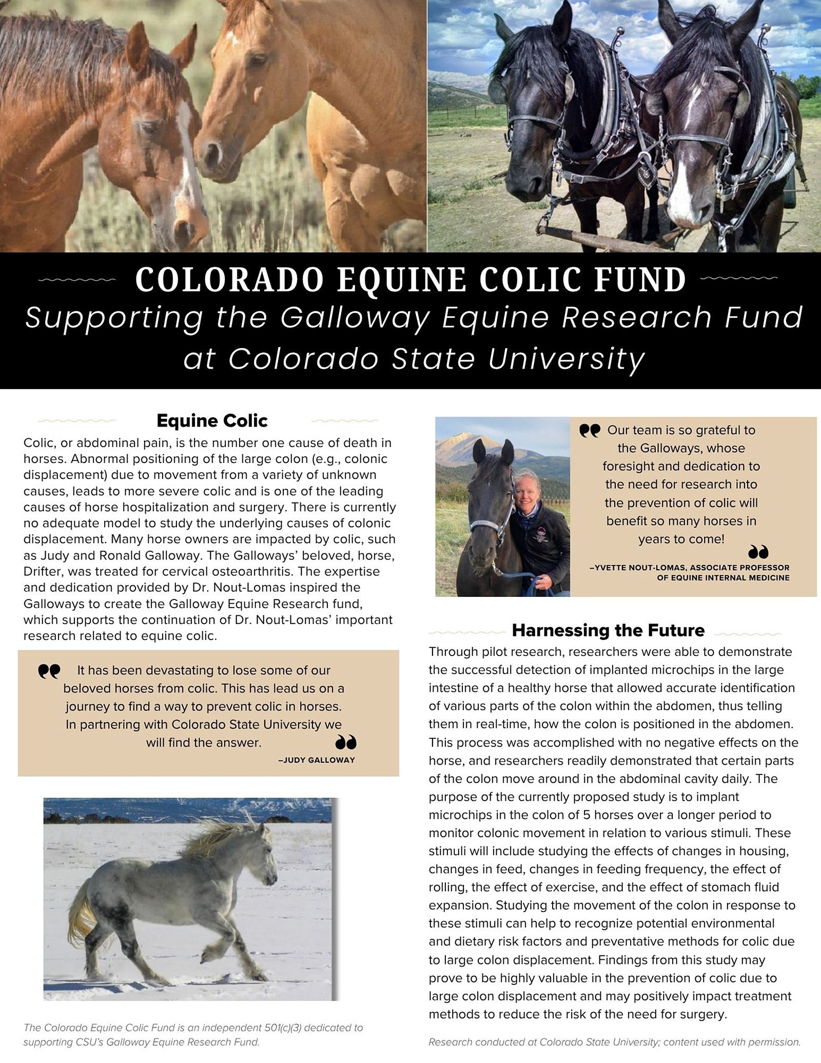 Through the Colorado Equine Colic Fund (a 501(c)(3) organization), you can directly support the vital, life-saving research being conducted by the Galloway Equine Research Fund at Colorado State University.