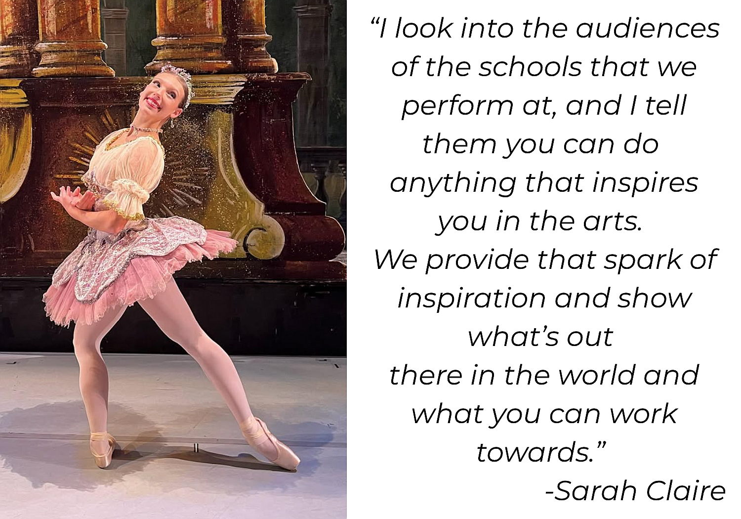 Studio Company Dancer Sarah Claire Martin was also introduced to ballet during a Student Matinee of Coppelia. She began dancing at the Academy at age seven and now performs in school assemblies, inspiring the next generation of dancers just as she was inspired as a young girl.