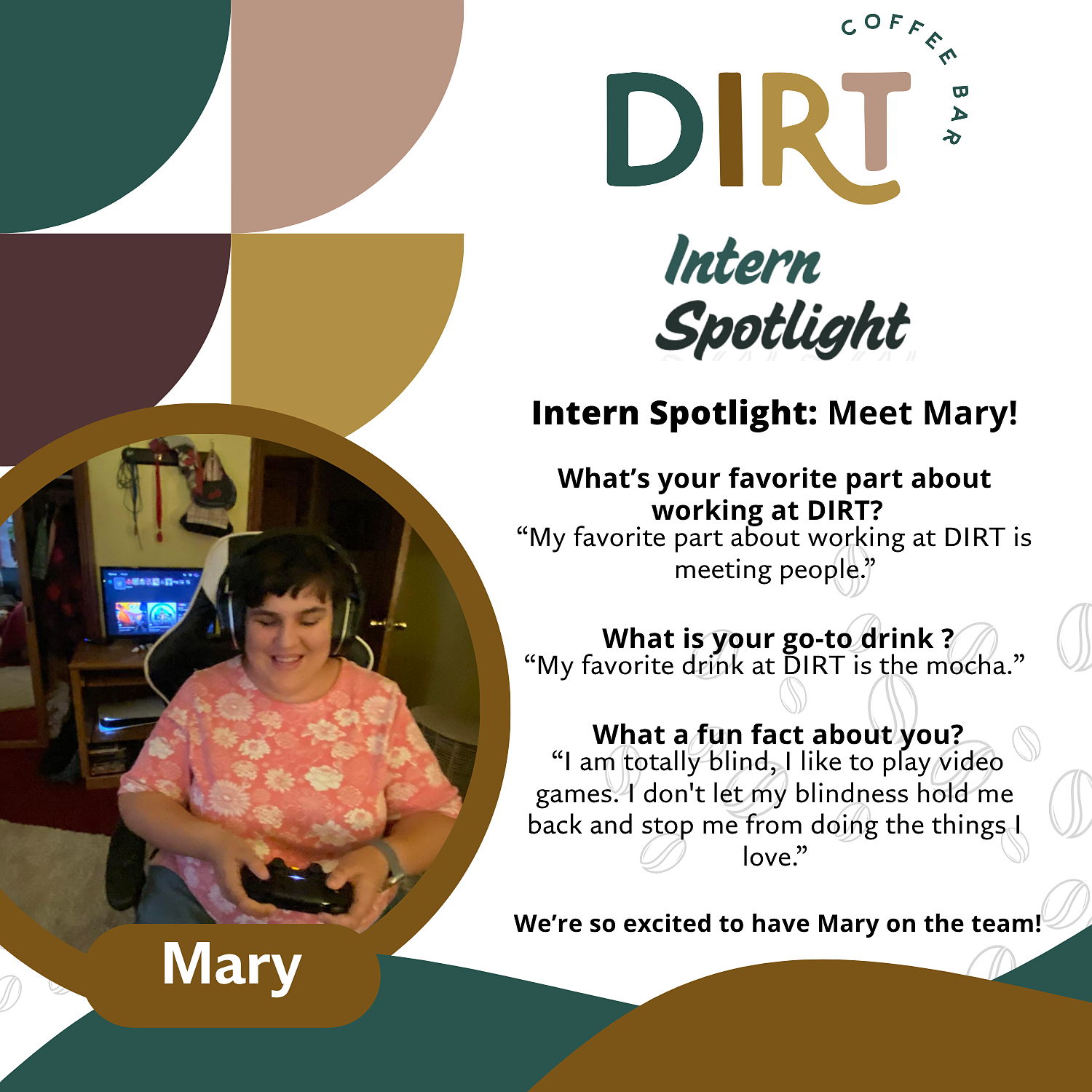 DIRT Coffee Bar Intern Spotlight featuring Mary.Summer Intern 2021: "A lot of the learning comes on the job. I took the first step, which is starting the internship. The most important thing I learned, if you are scared to try something like this - you should do it anyway. It will be worth it! I’d tell them that they should just go for it! I was a little bit worried that the coaching would be for people more impacted, but it still helped me. Don’t be afraid to say things and advocate for yourself!"