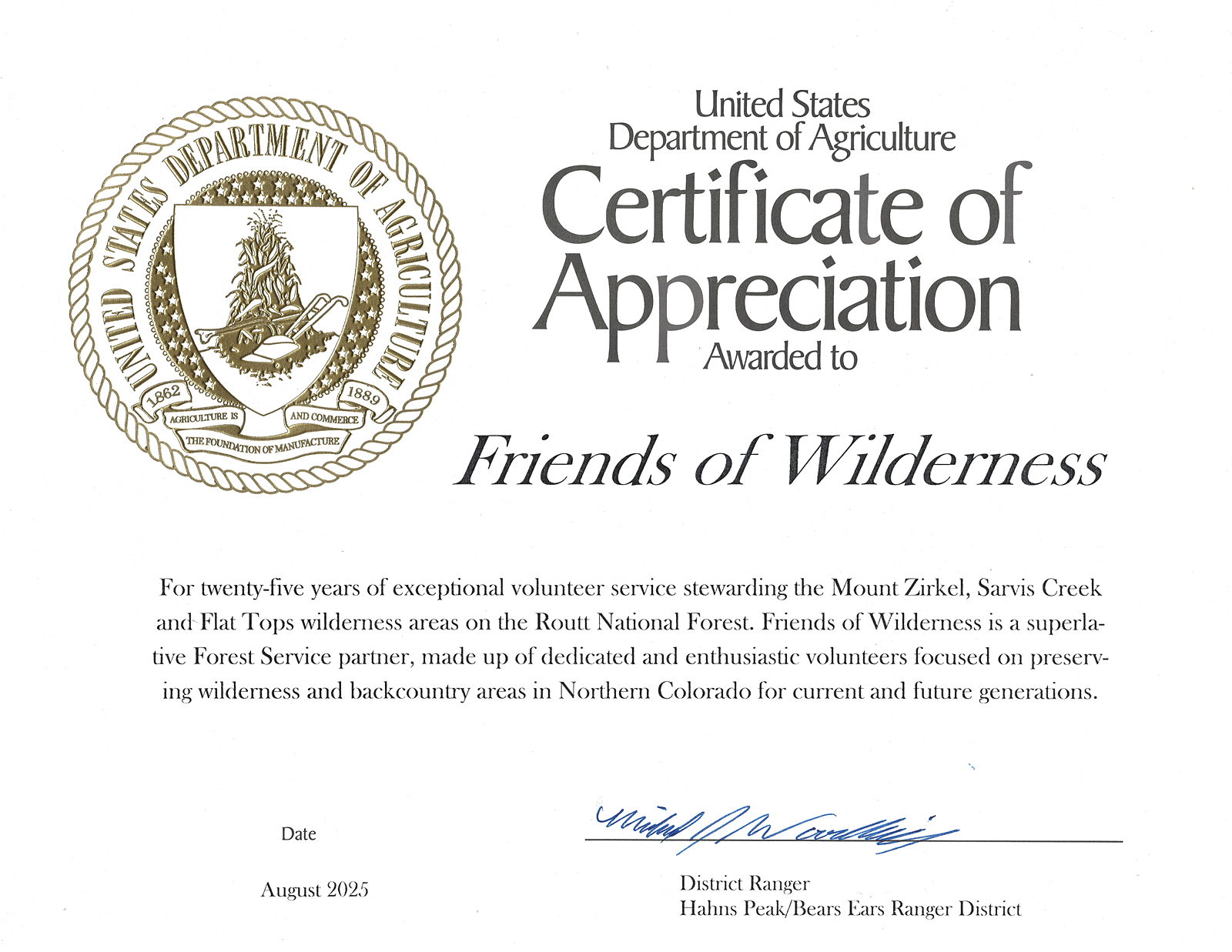 "Just wanted to extend a big thank you for the 2024 report you put together, and a huge thank you on our end to the absolutely essential amount of work FOW put in this year. The amount of hours and trees cut and time put in the Wilderness areas of the Routt is beyond huge. We couldn’t do it without you all, and all of your work from trails, to stewardship, and ambassadors is deeply appreciated. You all make a big difference for us. I hope fall is coming together for all of you well – just wanted to say thank you from our end. Please share the sentiment for all of your volunteers, you all are great."