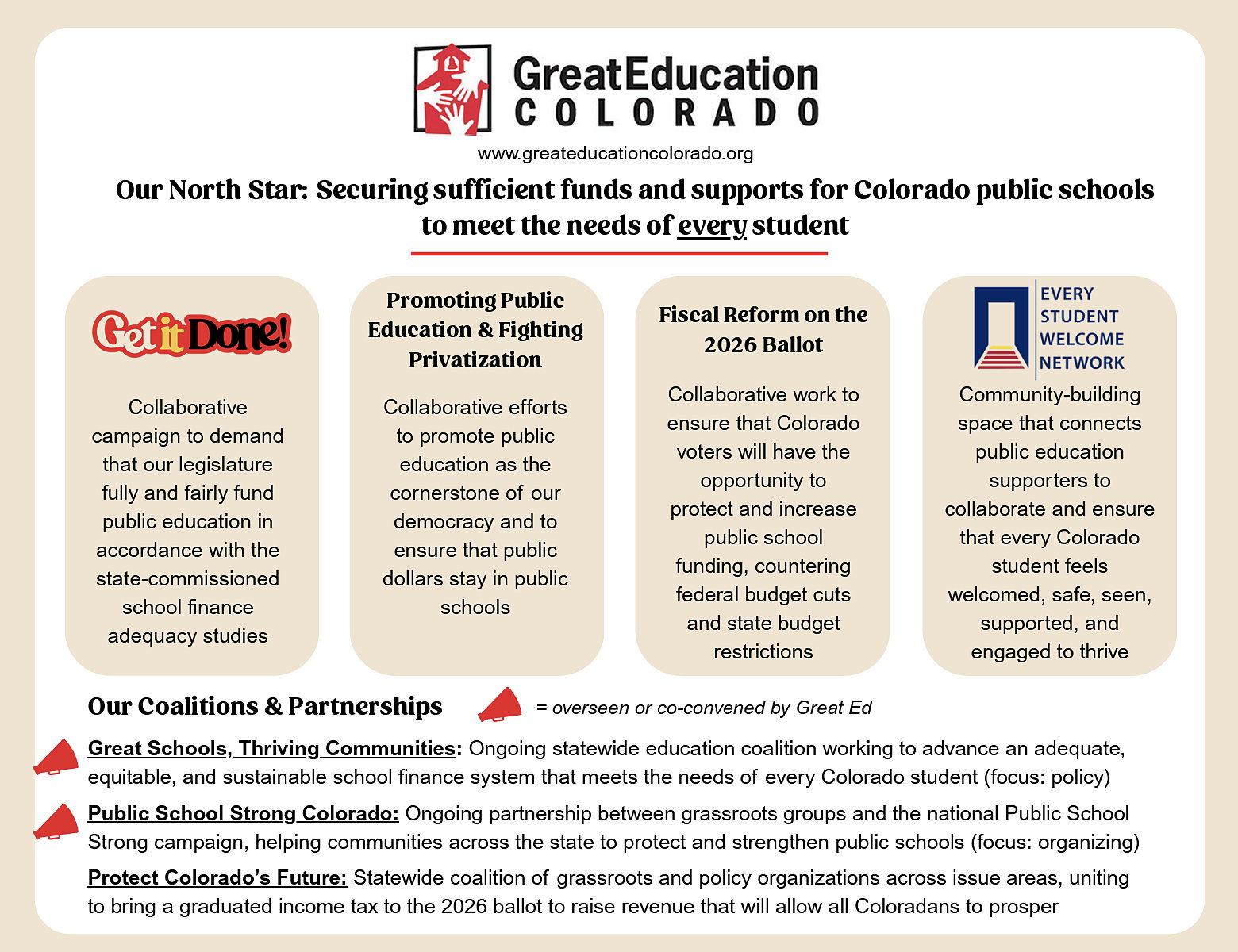 Our Mission: Great Education Colorado harnesses the power of grassroots activism and diverse, inclusive networks to guarantee that public schools in every Colorado community are welcoming and adequately, equitably, and sustainably funded.