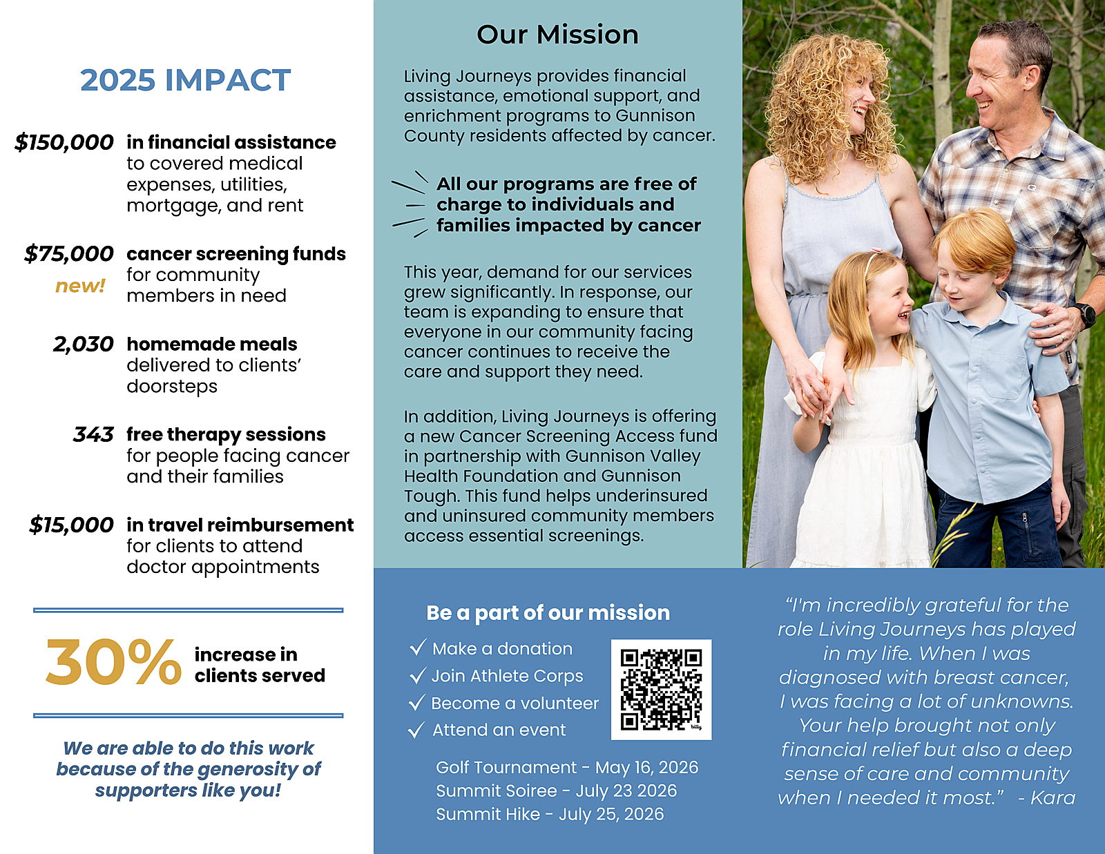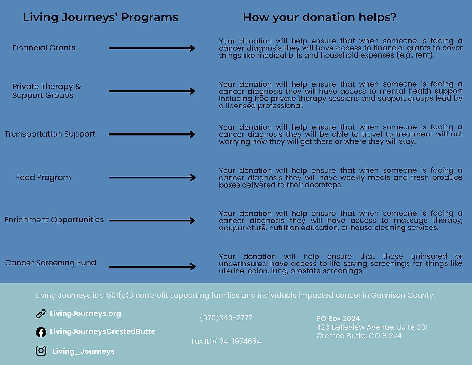 The mission and need for the organization was clear: to provide both emotional and financial support to individuals, regardless of cancer type, especially as more individuals and families fighting cancer in the Gunnison Valley continued to face severe financial strain due to medical bills, compounded by loss of income due to the inability to work. This led to the creation of Living Journeys' grant program, which offers financial assistance to those in need. Today, Living Journeys continues to offer both emotional support and financial relief, helping patients manage the psychological impact of their diagnosis while improving their quality of life and potentially enhancing treatment outcomes.