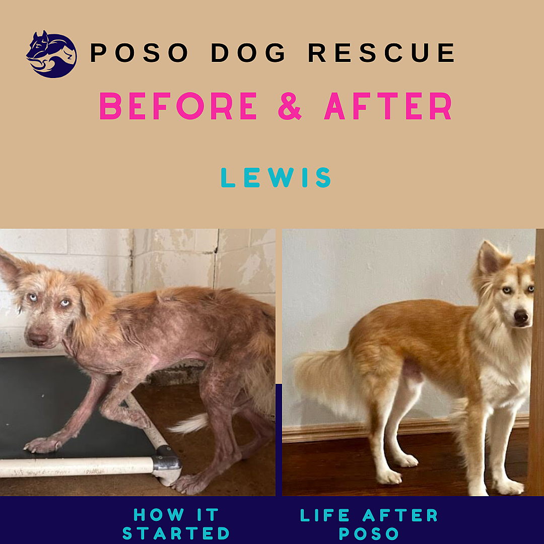 Lewis was found as a stray in southern Texas, he was brought into the shelter as a feral husky mix with no fur. And when I say no fur, I mean completely Bald. His before picture was actually shocking of how little care he had to have received in his 1 to 2 years here on earth. Along with being feral, Lewis had a few blood infections that needed to be medically treated as well as building his confidence over numerous months before he could be adopted out.