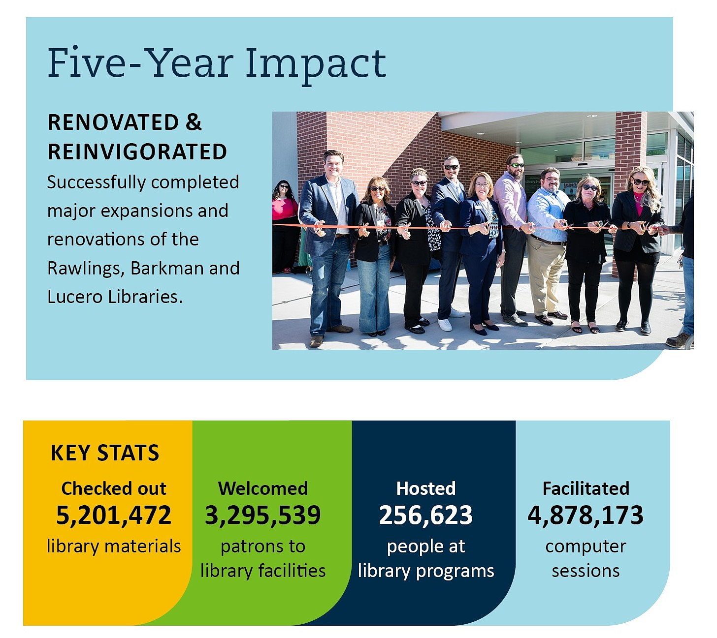 Over the past five years, under our previous strategic plan, the Pueblo City-County Library District served Pueblo by renovating the Rawlings, Barkman, and Lucero Libraries; expanding printed and digital collections; launching device and WiFi hotspot lending; and expanding our impact with signature programs like All Pueblo Reads and Youth Summer Reading.