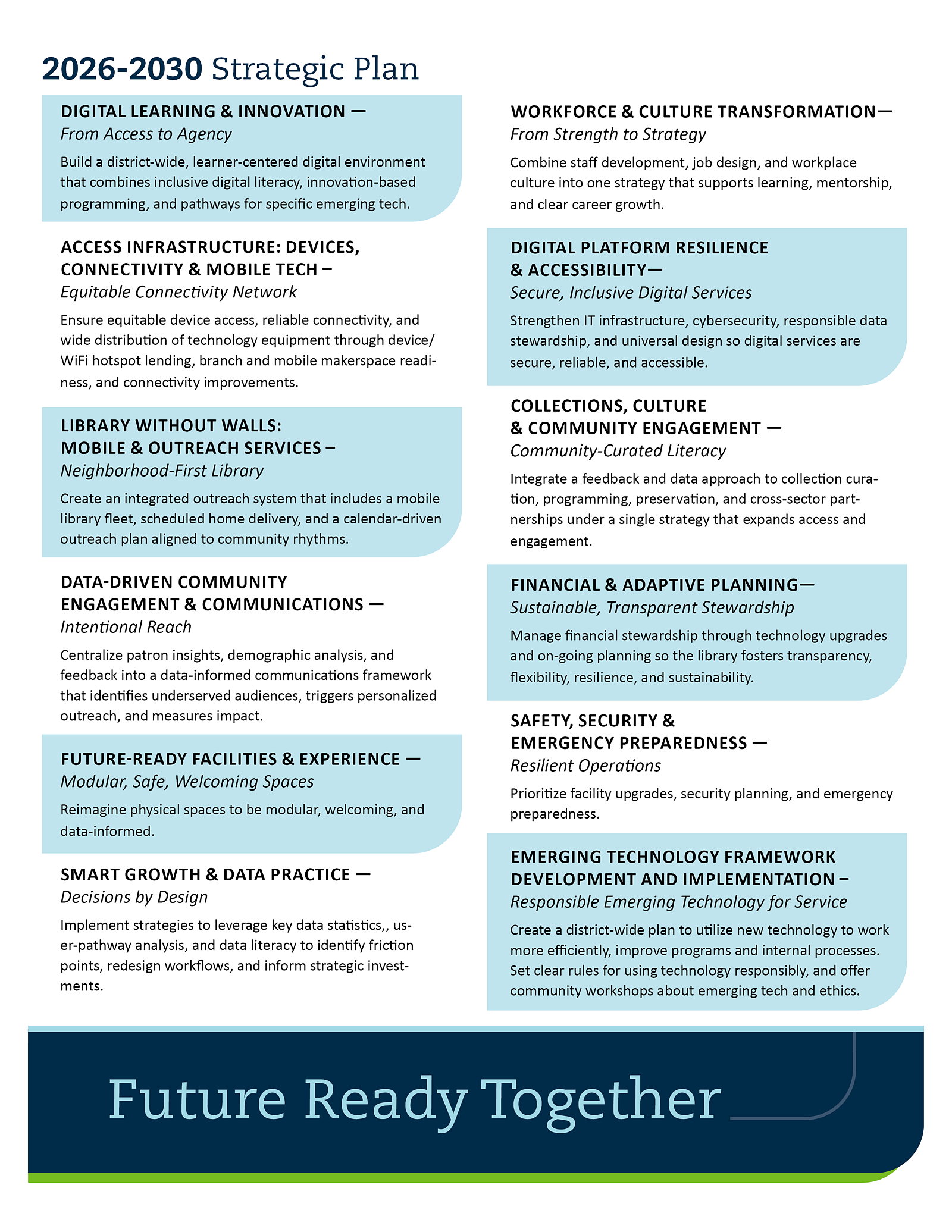 Our 2026–2030 plan, Future Ready Together, builds on that momentum with expanded digital learning, expanded outreach into our community, future-ready library facilities, data-driven engagement, and long-term fiscal stewardship. We will continue to provide a level of service to our community that continues to make our community proud of the Pueblo City-County Library District.