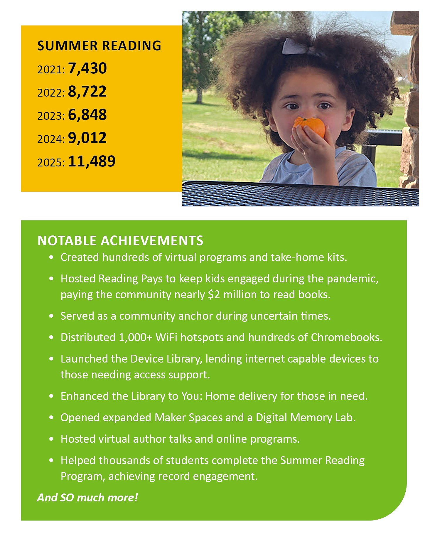 Much of this work took place during and after the pandemic, a period that reshaped service models and how we do business. We responded with ingenuity and a willingness to meet people where they are—keeping neighborhoods connected, supporting job-seekers and students, and maintaining vibrant public spaces. All of this was made possible by a ballot initiative that continued our funding, passed by voters in 2019.