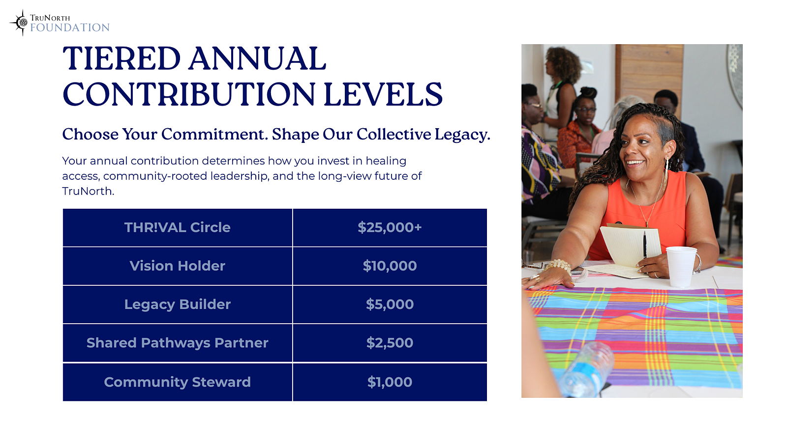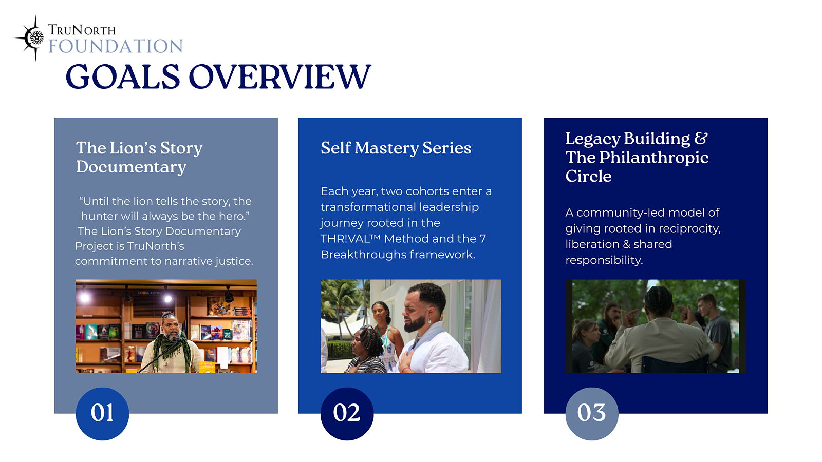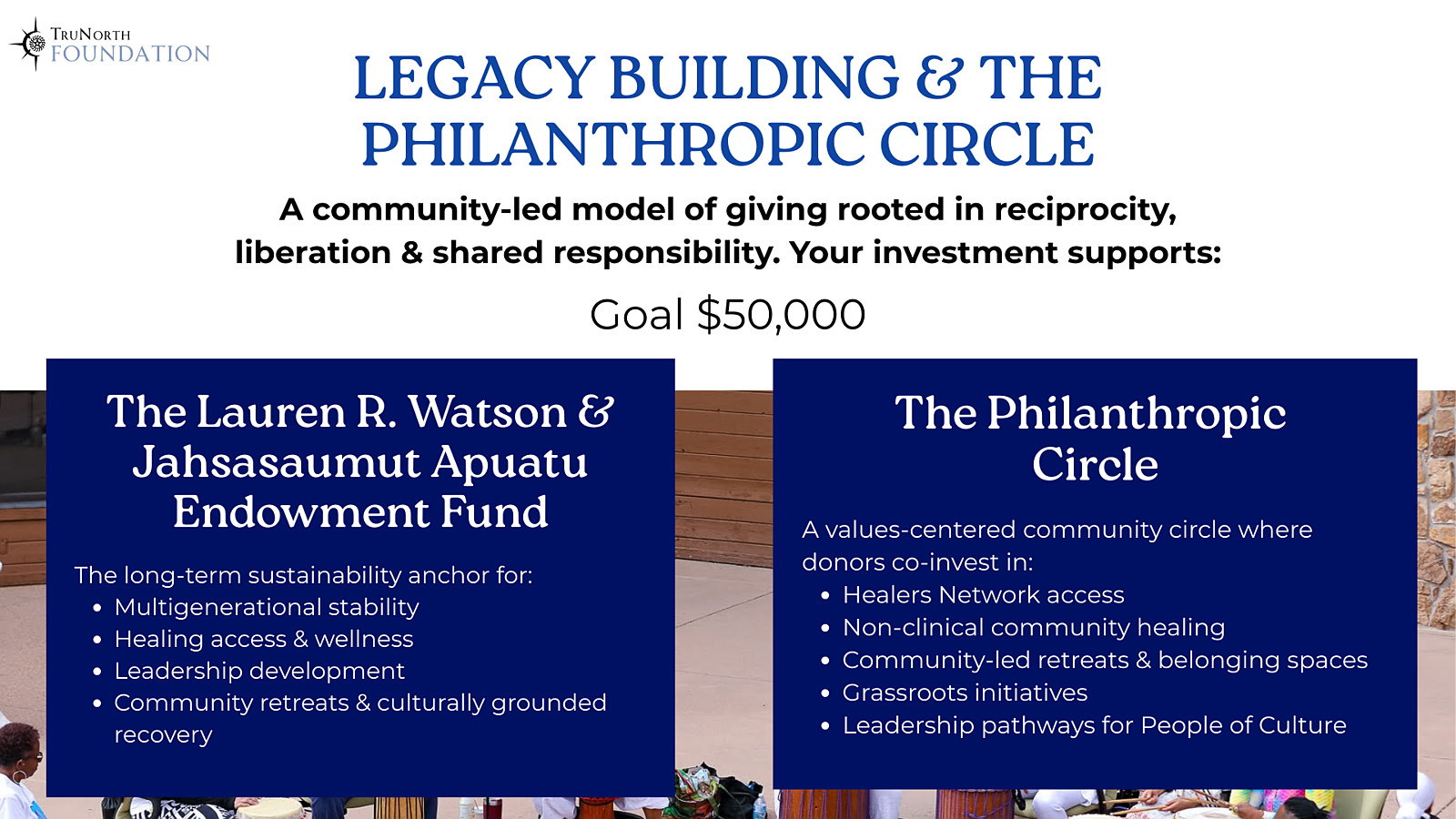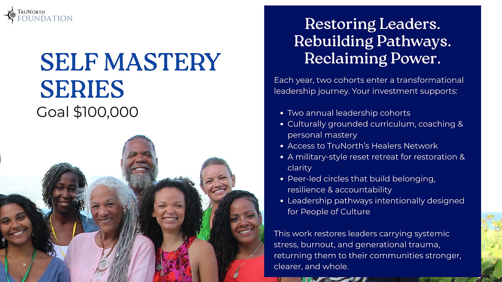 Born out of a commitment to providing culturally grounded care and holistic solutions, TruNorth Foundation seeks to bridge the gap between traditional Western systems and ancestral healing practices. Our work is informed by years of experience in community advocacy, leadership development, and economic empowerment. We are dedicated to creating sustainable models for personal and community growth, supporting a diverse range of programs that include human development coaching, wellness retreats, and strategic philanthropic initiatives. By focusing on the root causes of inequality, TruNorth Foundation aims to foster long-term change, creating pathways for self-empowerment and economic resilience. Through our collaborations with TruNorth Institute and other partners, we continue to drive forward a vision of collective healing and systemic transformation.