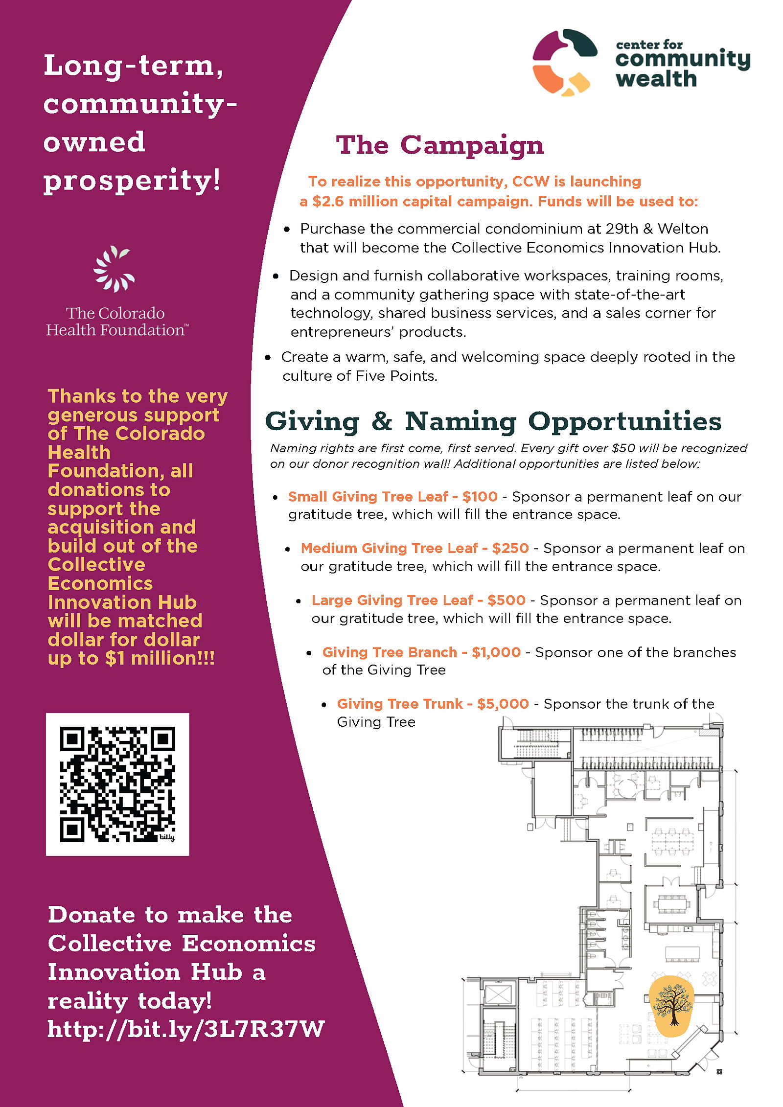 As our final design for the Collective Economics Innovation Hub rounds into shape, we are pleased to announce a number of exciting naming opportunities for donors to our capital campaign. We are planning a beautiful custom Giving Tree installation at the entrance to the space to honor those who have helped make the Hub possible. Please see below for giving levels. If you would like to donate directly to CCW rather than through the Colorado Gives platform, please contact Yessica Holguin, Executive Director, at yessica@communitywealth.org.