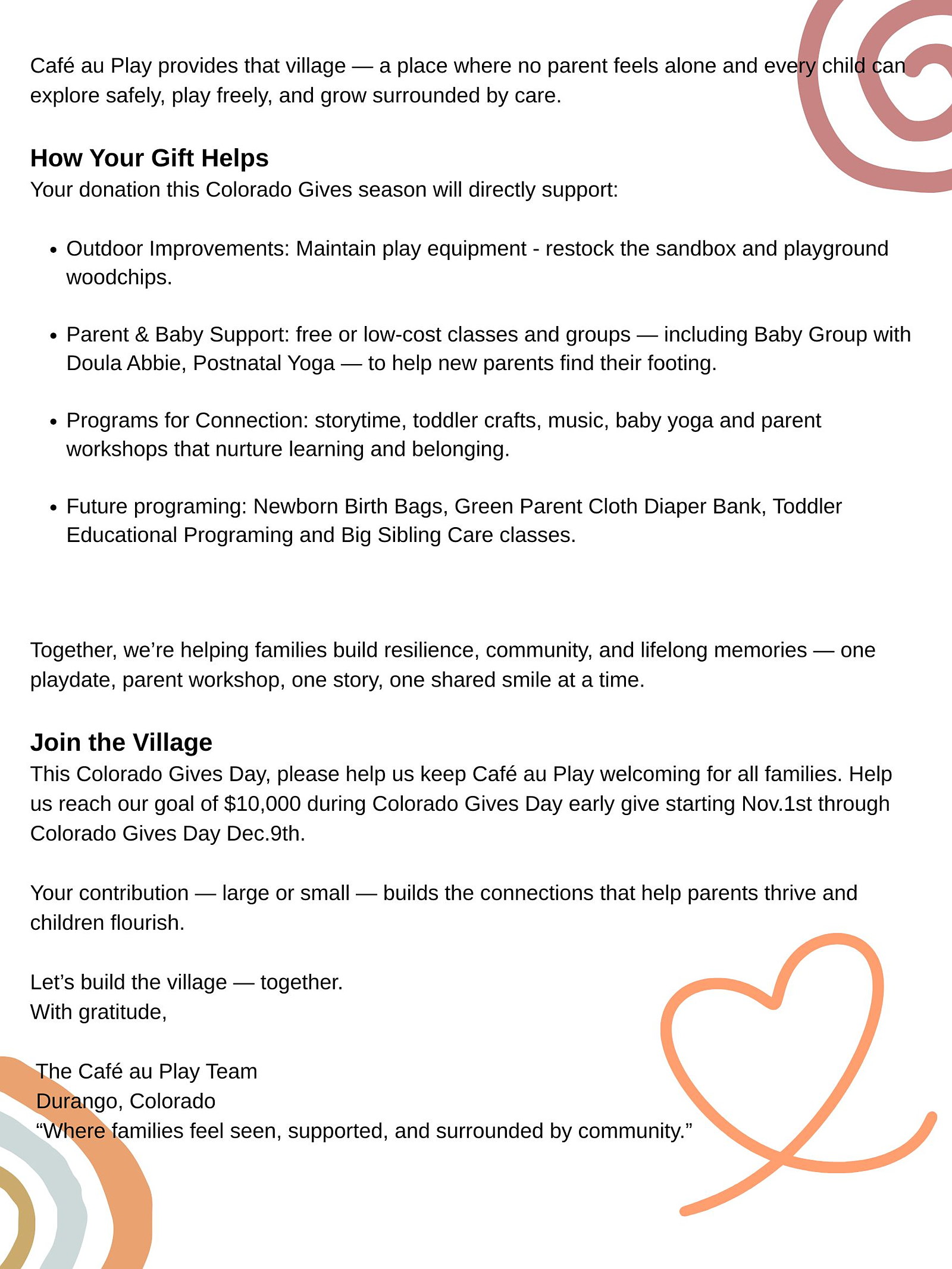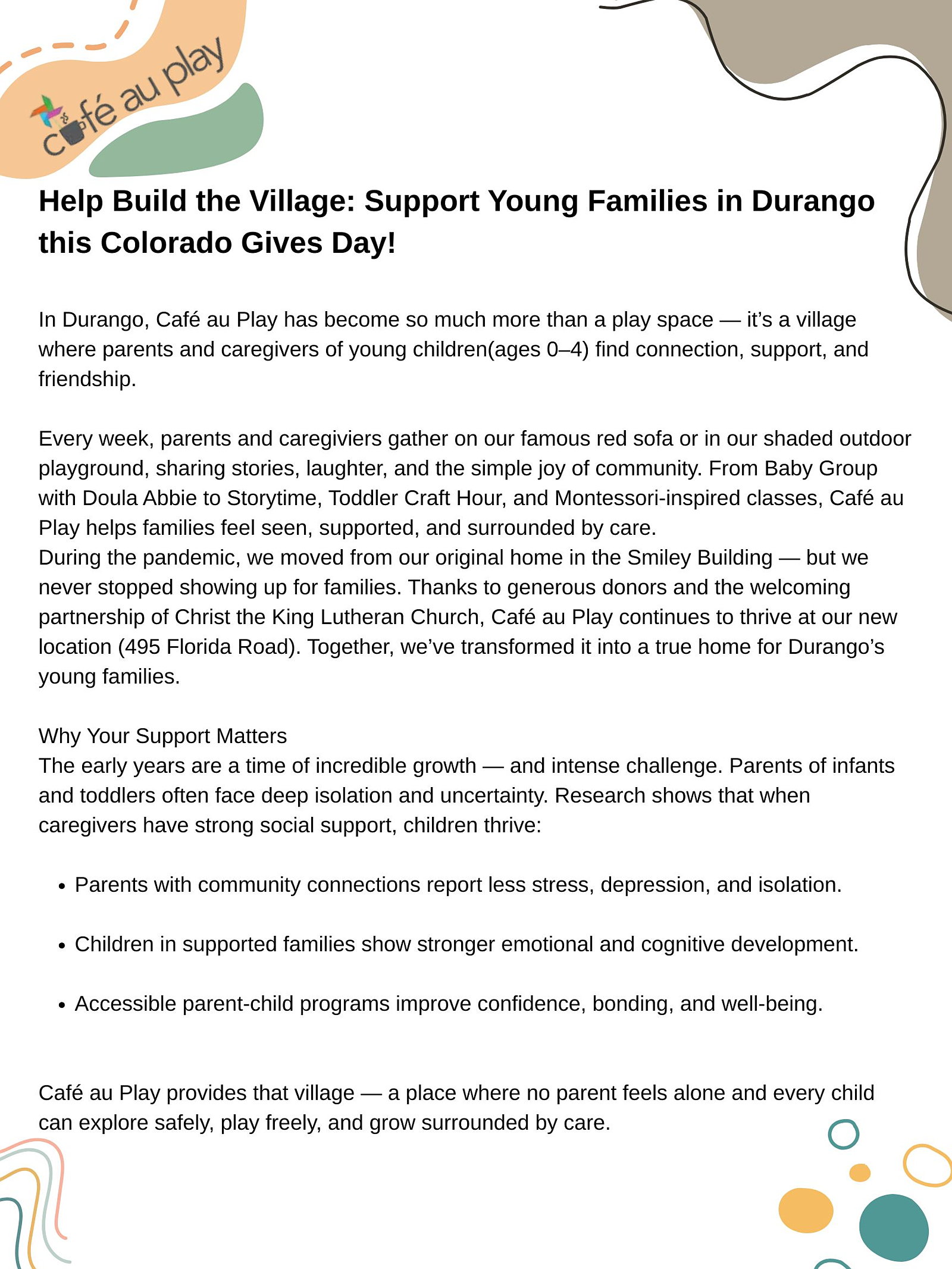 Community Foundation serving Southwest ColoradoGive families a village - Support Café au Play today! Learn. Connect. Thrive.