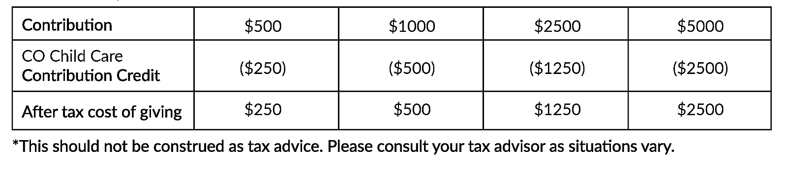 Did you know? Your donation qualifies for the Colorado Child Care Contribution Tax Credit. Colorado taxpayers who make a monetary contribution to promote child care in Colorado may claim an income tax credit of 50% of their total contribution.