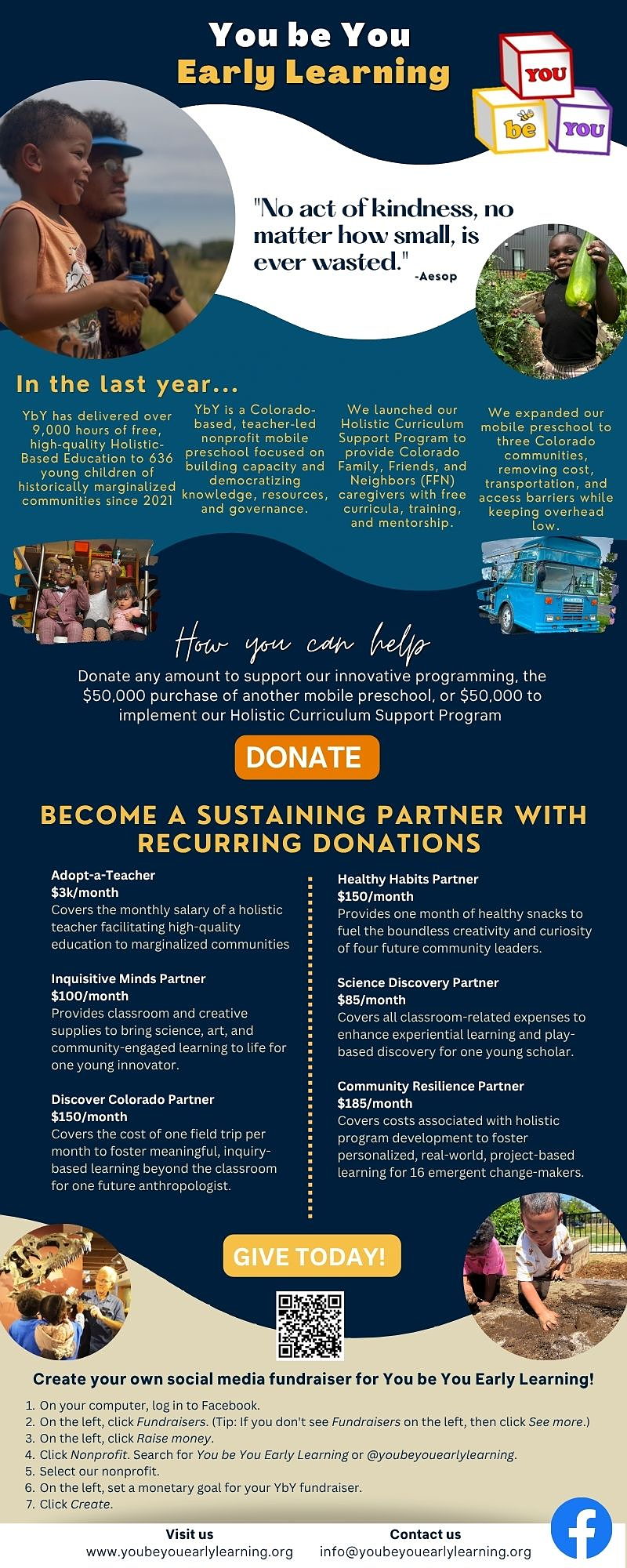 You be You Early Learning (YbY) is a Colorado-based teacher-led nonprofit preschool. rooted in the principles of diversity, equity, inclusion, belonging, and social justice. At YbY, we offer personalized, inquiry-based learning opportunities that enable students and families to grow together. We celebrate students' intersectional identities and diverse perspectives and connect their lived experiences to new learning. YbY teachers promote social-emotional growth and encourage students to develop their unique talents through cooperative, play-based discovery.