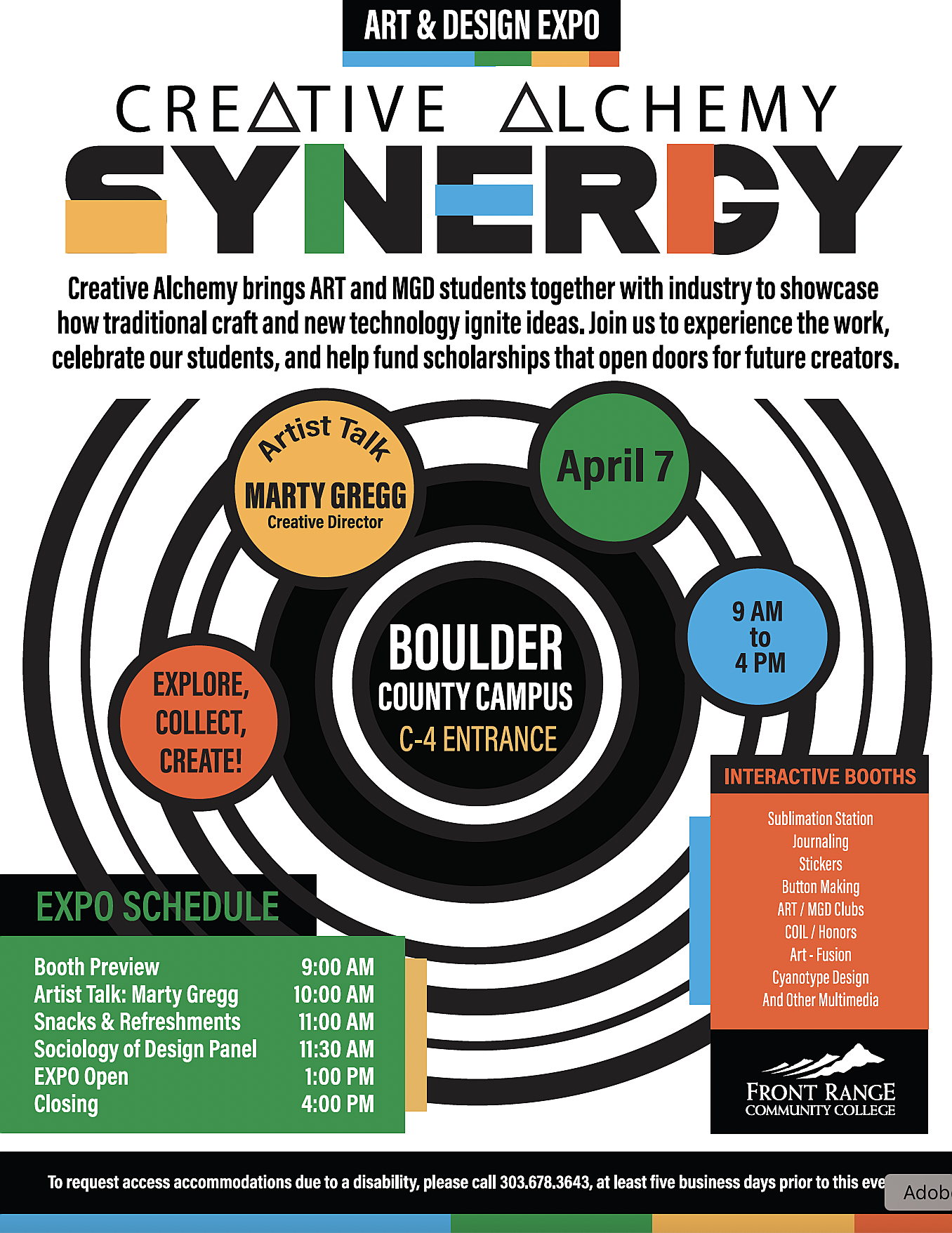 We are ART & MGD (Multimedia Graphic Design) at Front Range Community College, reaching out to invite you to help us raise funds for student scholarships while celebrating the arts at our 2026 SYNERGY EXPO at the Boulder County Campus.