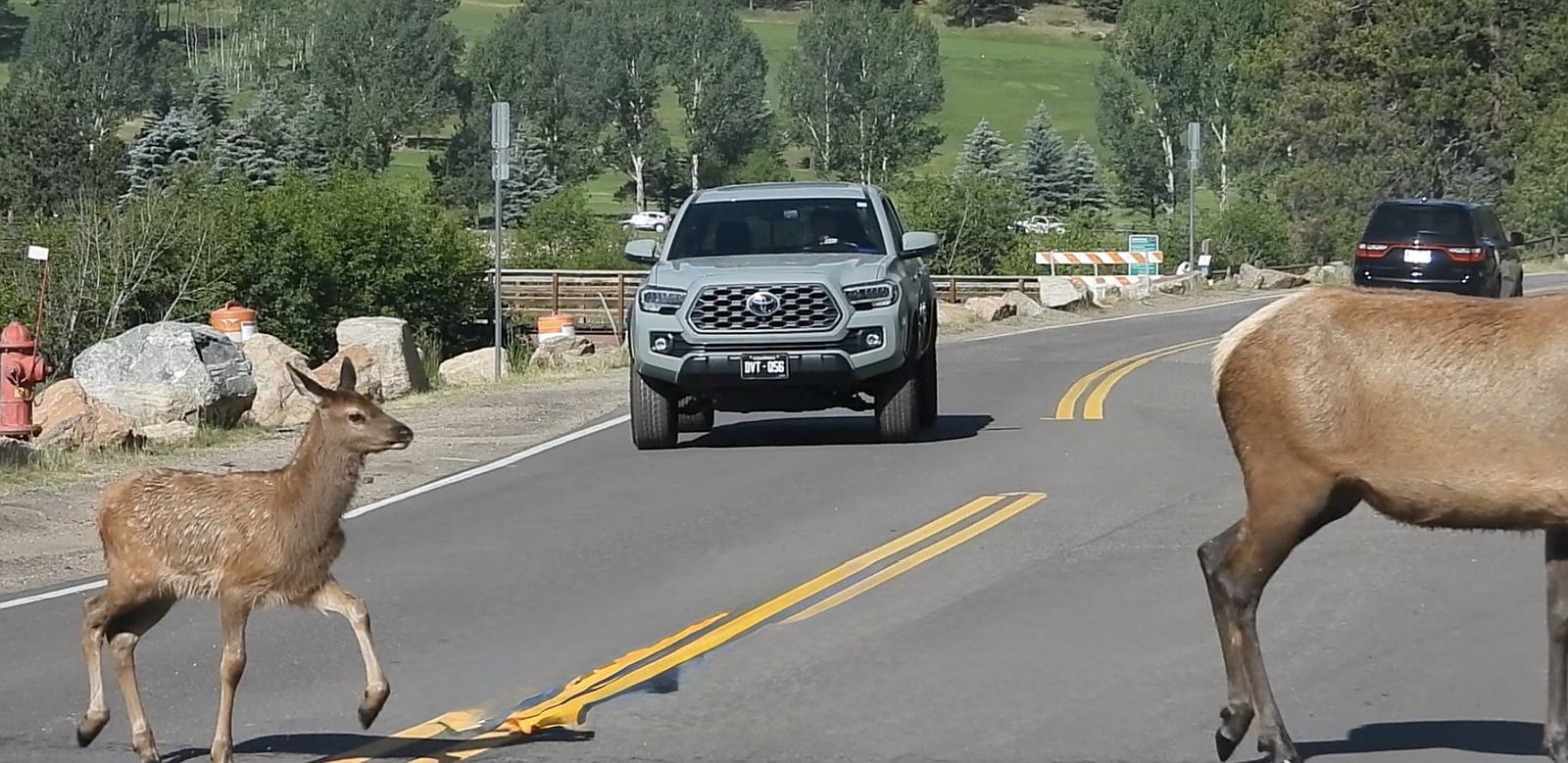 Summer in Colorado means new life — and new danger. Tourist traffic spikes during wildlife baby season, leading to thousands of wildlife-vehicle collisions (WVCs) each year, threatening animals, drivers, and communities.Elk cow and calf crossing road - June 2025, Evergreen Lake.