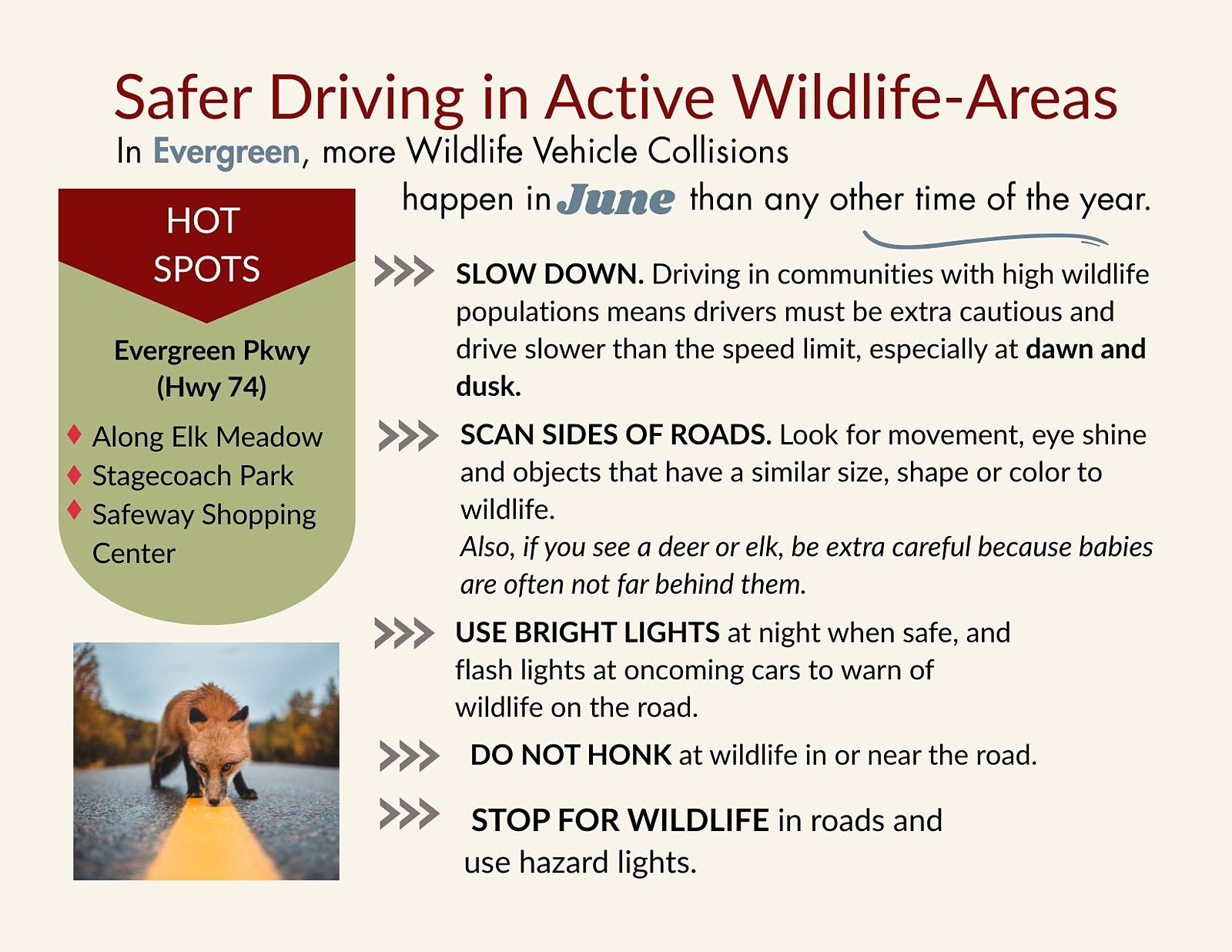 Wild Aware, founded in 2019, aims to reduce wildlife-vehicle collisions on Highway 74 and Highway 73 in Evergreen, CO. Working with CDOT and CPW, permanent variable message signs were installed in 2024 along Highway 74 in the two areas with the highest wildlife-vehicle collisions.