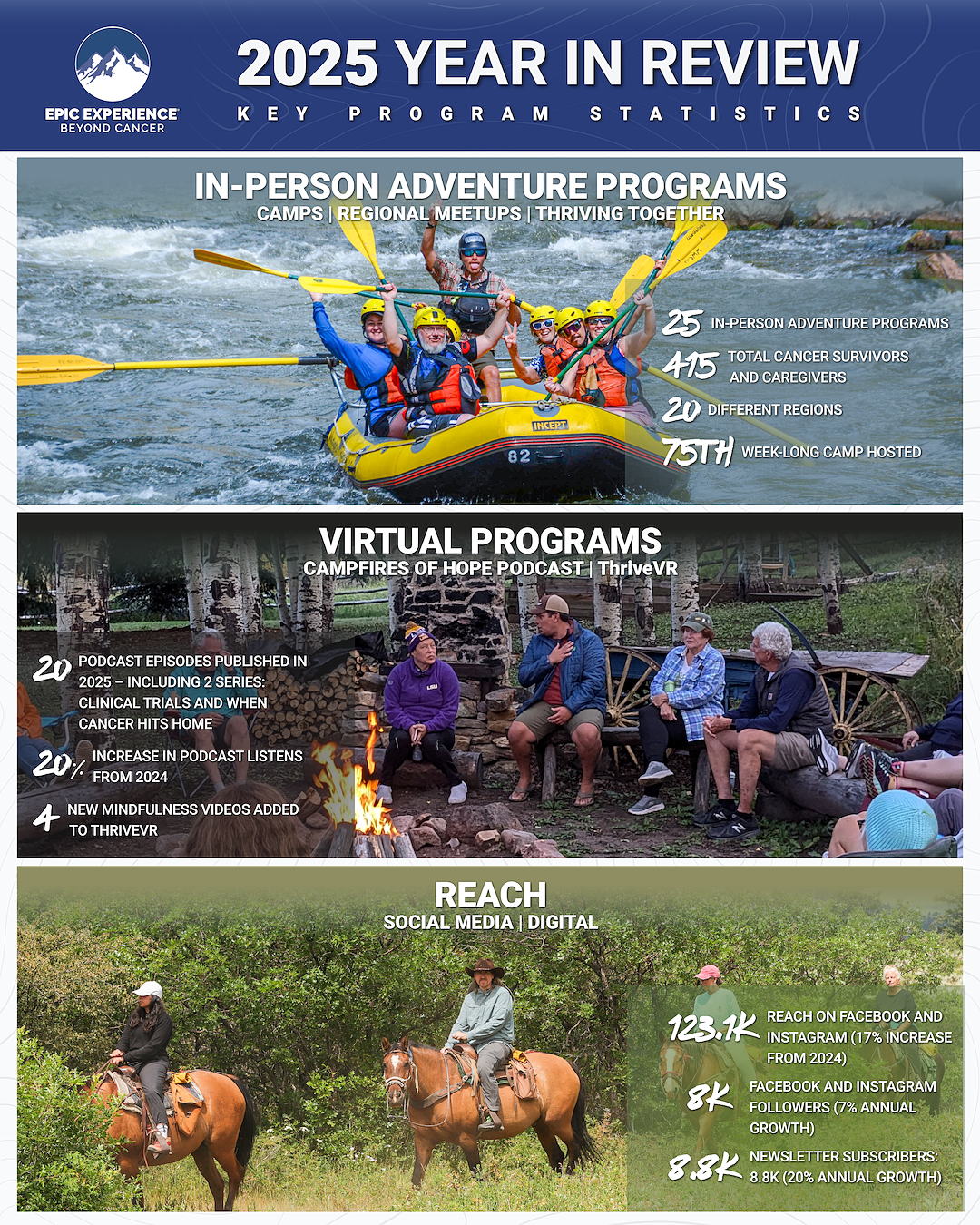 This Giving Season (November 1 through Colorado Gives Day on December 9), we invite you to join us in making a difference in the lives of adult cancer survivors. Your support will help Epic Experience continue to provide transformative programs that offer hope, healing, and community to those affected by the physical, mental, and emotional effects of cancer.