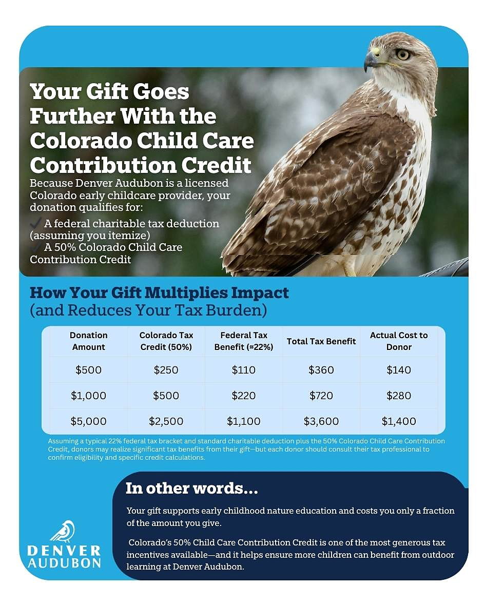 Denver Audubon is an approved early childcare provider, which means gifts to our early childhood programs may qualify for the Colorado Child Care Contribution Tax Credit.