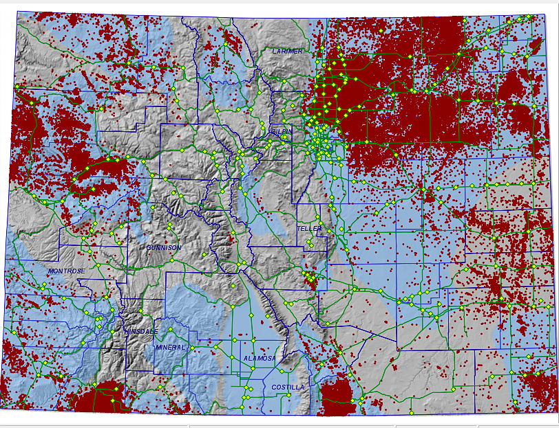 See all those red dots? That is all of the oil and gas wells in the state of Colorado. Many of them are just a few feet away from homes, schools, playgrounds. Putting our communities and climate at risk by exposing us to toxic chemicals in our water, explosions, and dangerous air pollution.