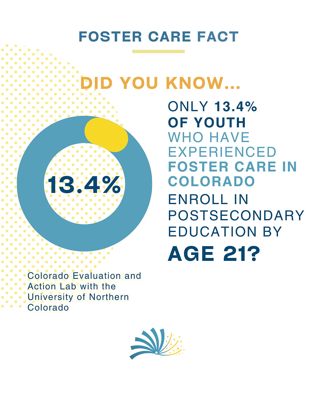 Only 13.4% of youth who have experience in foster care in Colorado enroll in postsecondary education by age 21, compared to 49.9% of their peers. Of that 13%, just 3% graduate with a college degree.